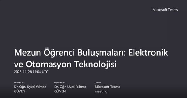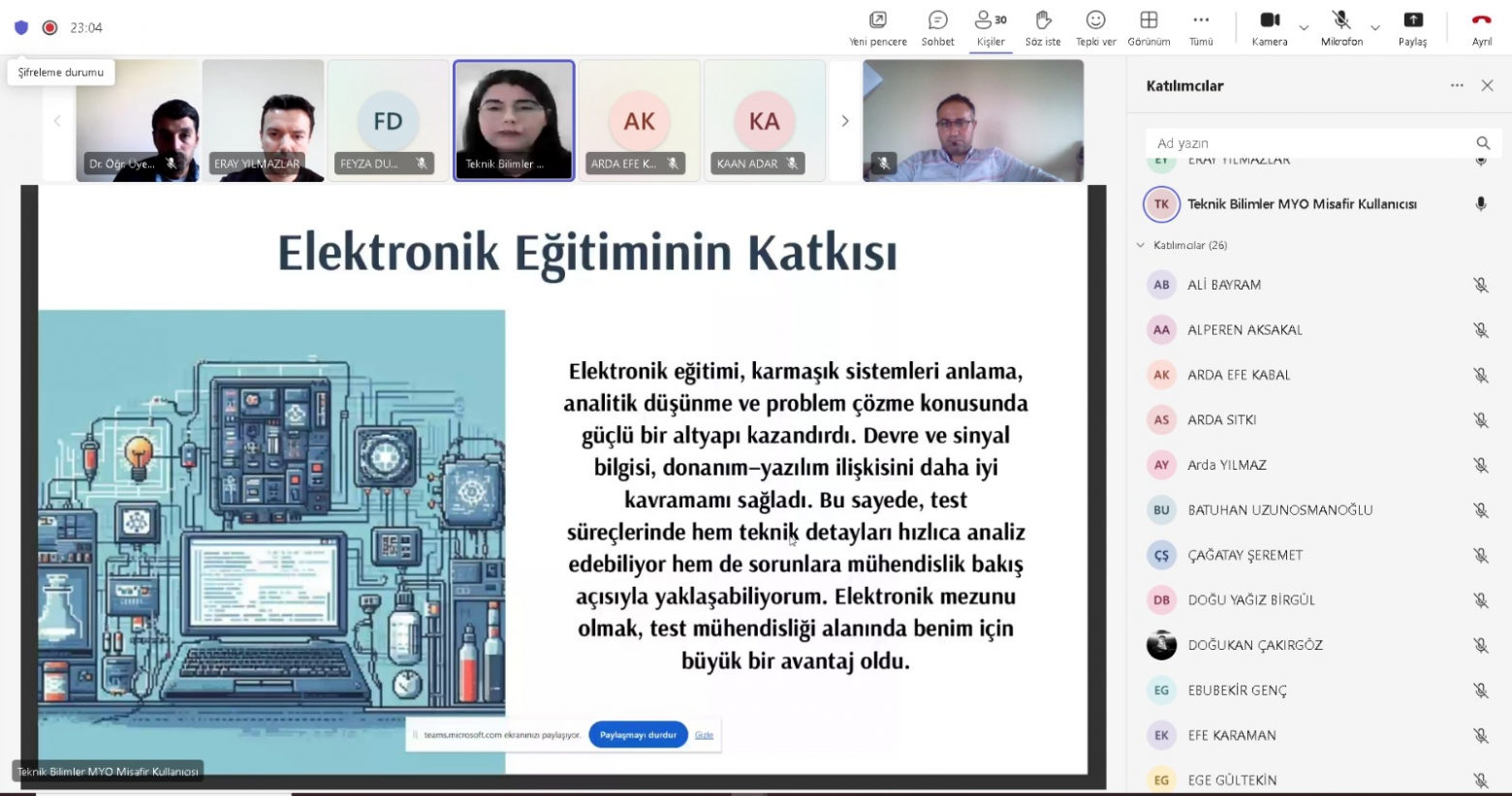 Üniversitemizin Elektronik Teknolojisi ve Mekatronik programları tarafından düzenlenen “Mezun–Öğrenci Buluşmaları” etkinliği, Dr. Öğr. Üyesi Yılmaz Güven’inin yönlendirmesiyle Elektronik Teknolojisi Programı mezunumuz Berivan Pekdemir’in ve 70’i aşkın öğrencimizin katılımıyla gerçekleştirildi.